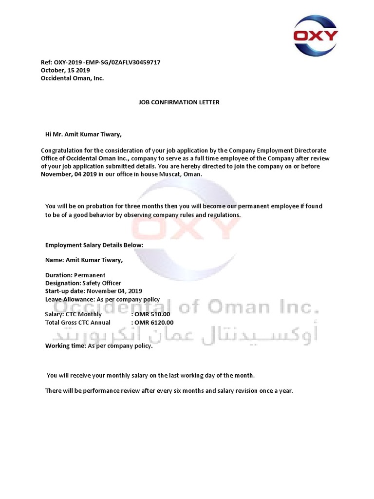 Job Confirmation Letter Employment Letter Job Offer Letter